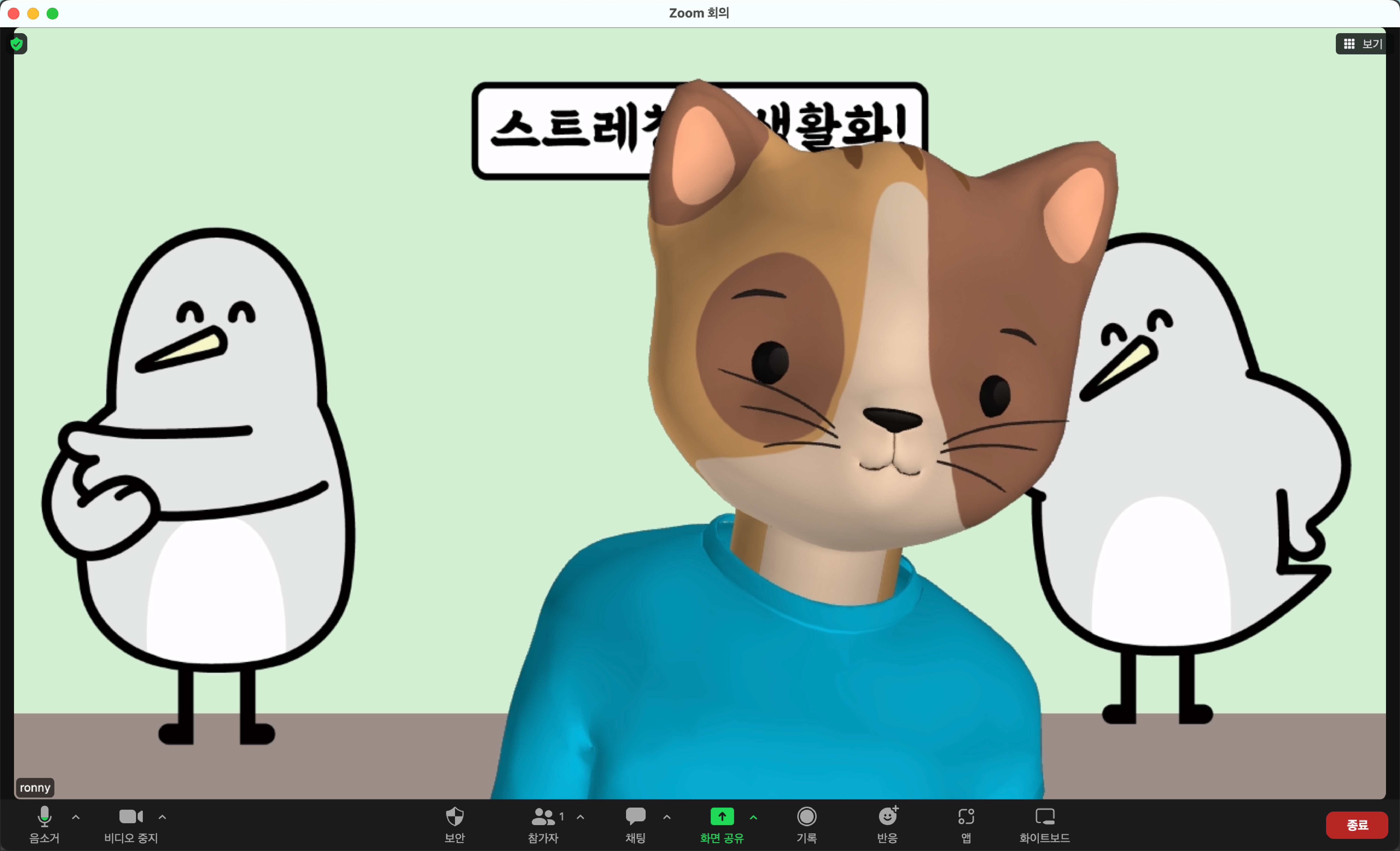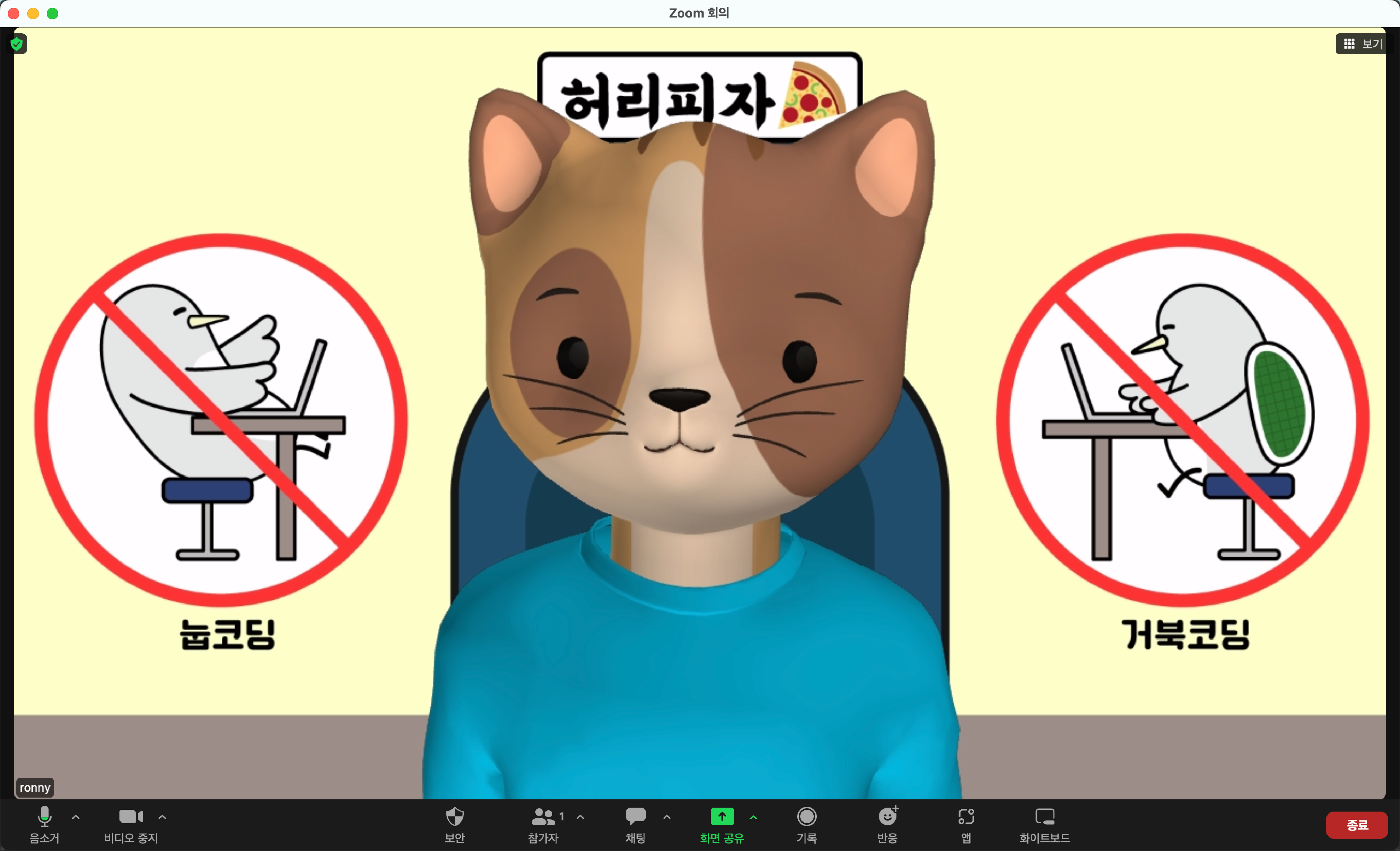 나도 모르게 거북목+눕코딩이 되는 개발자는 고개를 들어 줌배경을 봐주세요. 양 옆의 머쓱이를 보고 경각심을 깨닫길 바라요! (+ 나는야 같이 회의하는 개발자의 허리도 챙길 줄 아는 센스 있는 개발자)