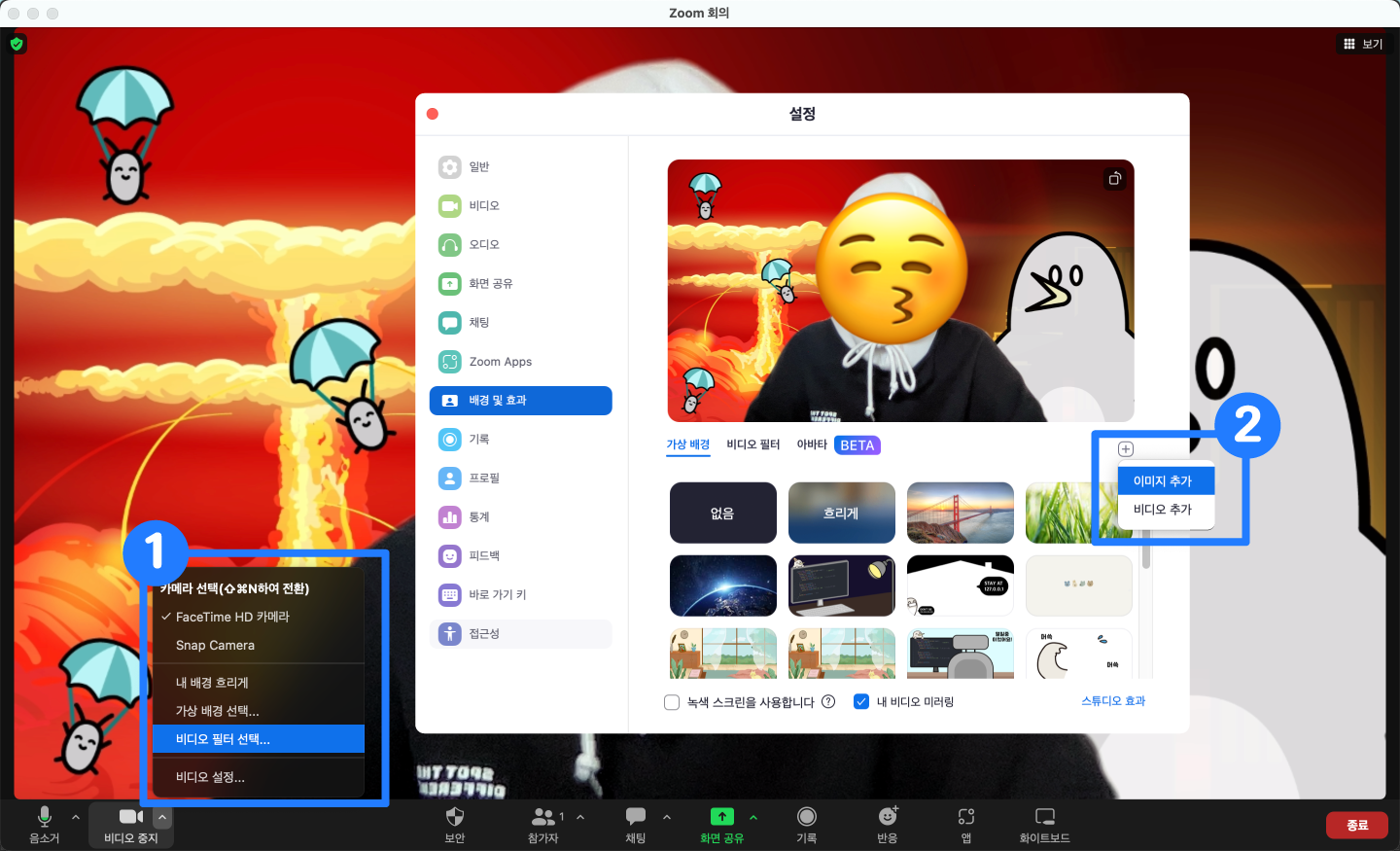 - 원하는 배경을 선택하면 ZOOM 배경 화면이 설정됩니다.