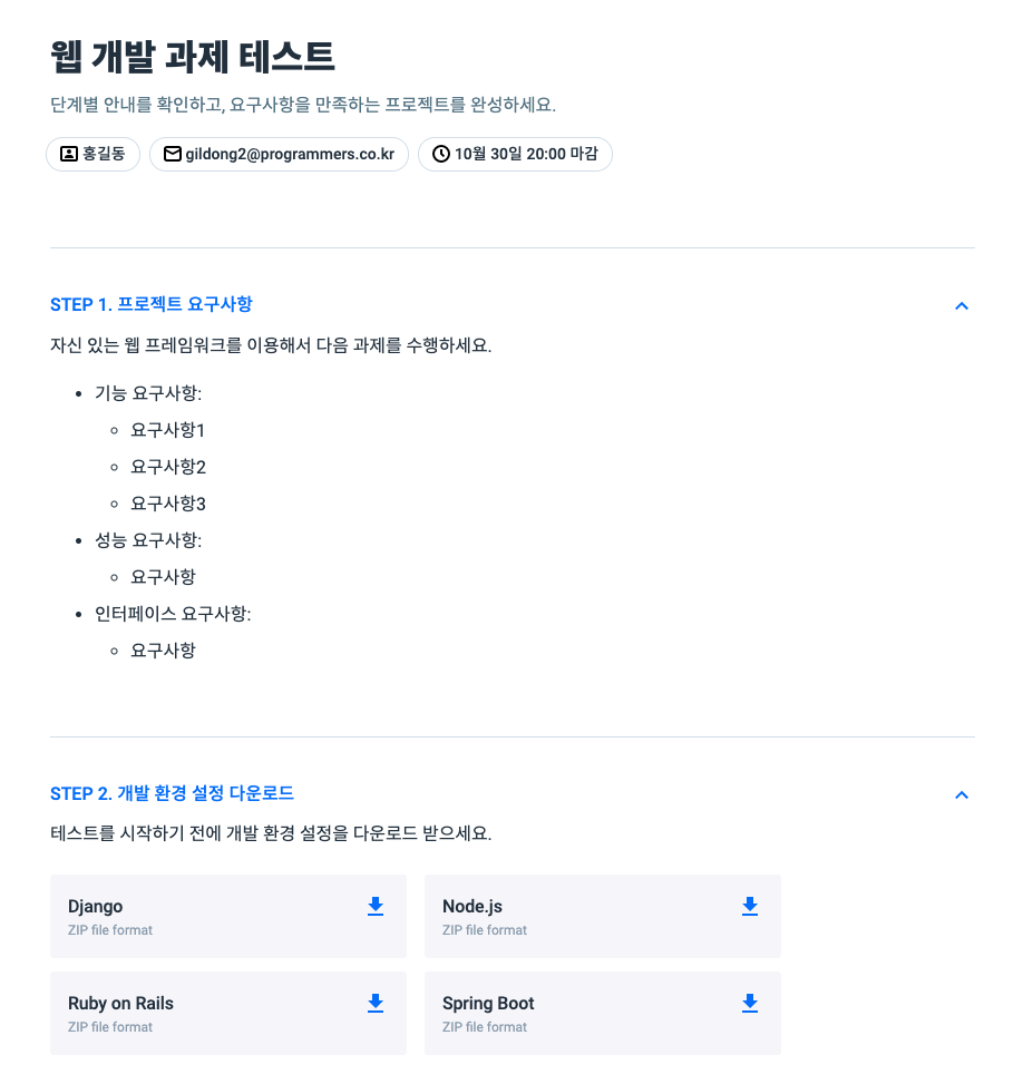 아래는 지원자 입장에서 보이는 페이지입니다. 기업에서 작성한 과제 요구사항과 사용할 수 있는 개발 환경을 확인할 수 있습니다. 개발 환경의 경우 꼭 프로그래머스가 제공하는 파일을 기반으로 세팅해야 실행에 문제가 없습니다.