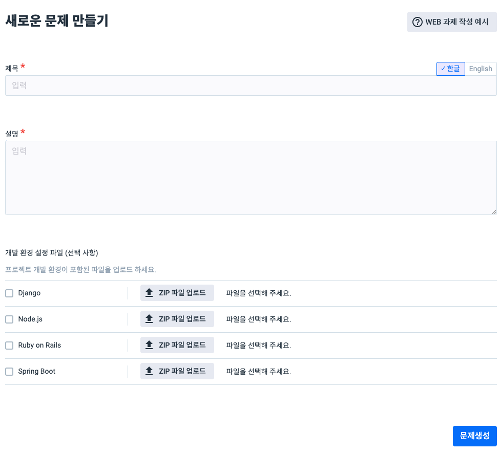 Tip! 2019년 10월 3일 기준 Django, Node.js, Ruby on Rails, Spring Boot 과제를 낼 수 있습니다. 지원하는 프레임워크는 점차 넓혀갈 예정입니다.