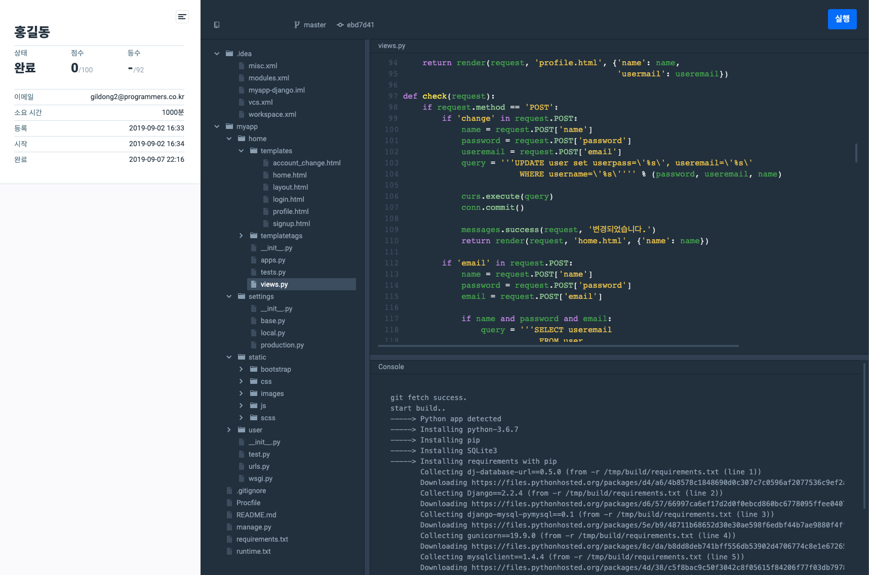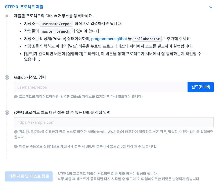 프로젝트 제출에 있어 약간의 규칙이 있습니다. 해당 내용을 잘 읽어보시고 제출해주세요. 이렇게 최종 제출을 마치면 과제 테스트가 종료됩니다. 스크린샷에 보이듯, 빌드(Build) 버튼을 누르면 프로그래머스 서버에서 소스코드를 빌드한 뒤 실행하게 됩니다. 프로젝트에 문제가 없다면 해당 버튼이 실행하기 버튼으로 바뀌죠. 이를 통해 지원자는 외부 서버를 세팅하거나 할 필요 없이 단 한 번의 버튼 클릭으로 프로젝트의 정상 동작 여부를 확인할 수 있는 것이죠.