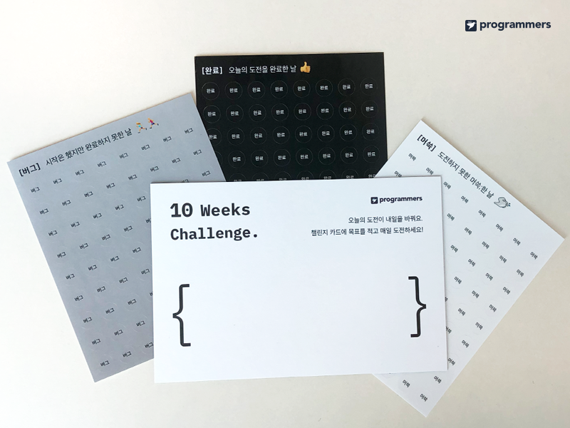 { 1일 1 커밋 }, { 컴퓨터 할 때 허리 펴기 }와 같은 크고 작은 도전을 돕는 챌린지 카드입니다. 10주 동안 도전을 완료한 날에는 [완료] 스티커를, 시작은 했지만 완료하지 못한 날에는 [버그] 스티커를, 아무것도 못한 날에는 [머쓱] 스티커를 붙입니다. 머쓱 머쓱 머쓱해지지 않도록 열심히 도전해봅시다.