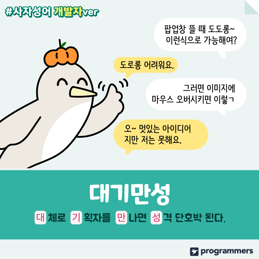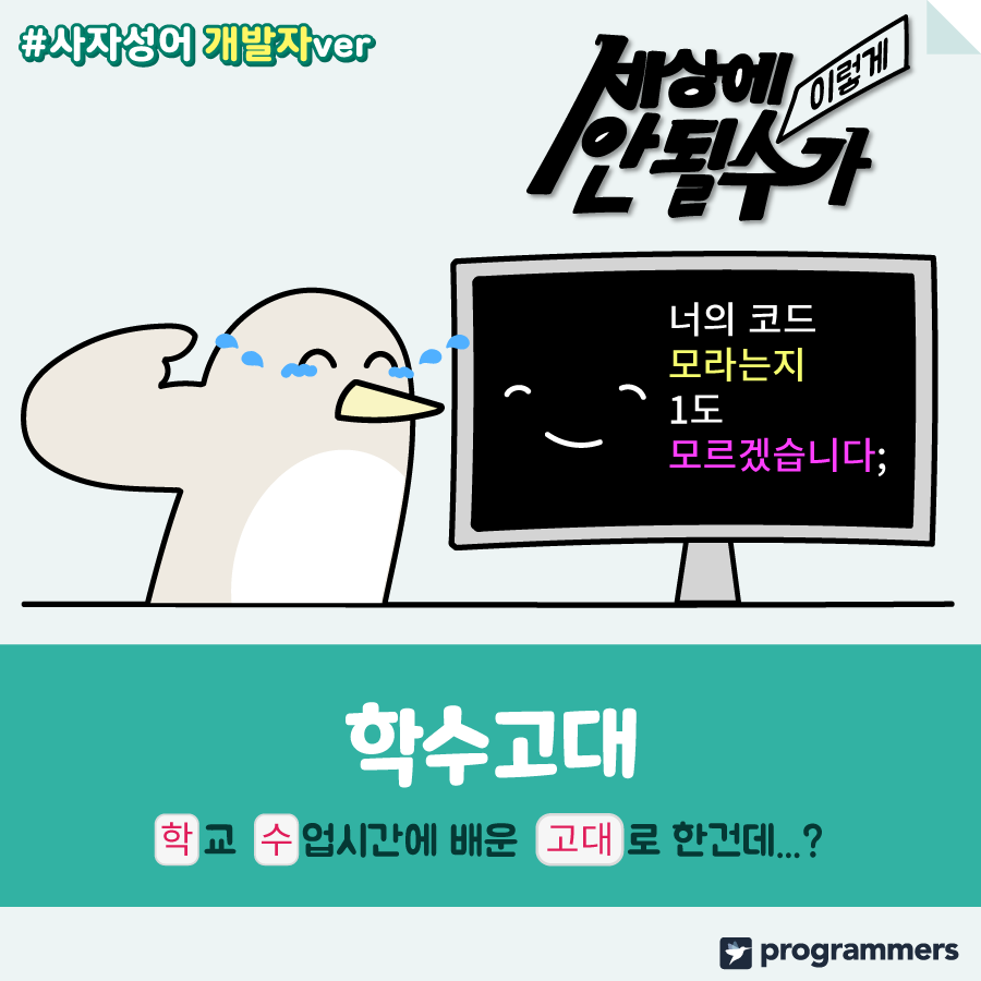 매주 한 개씩 페이스북에 발행되었던 '개발자ver 사자성어'! 컴퓨터 화면만 보느라 눈이 퀭해진 개발자에게 사자성어 짤 하나씩 처방해 주면 어떨까요?💊