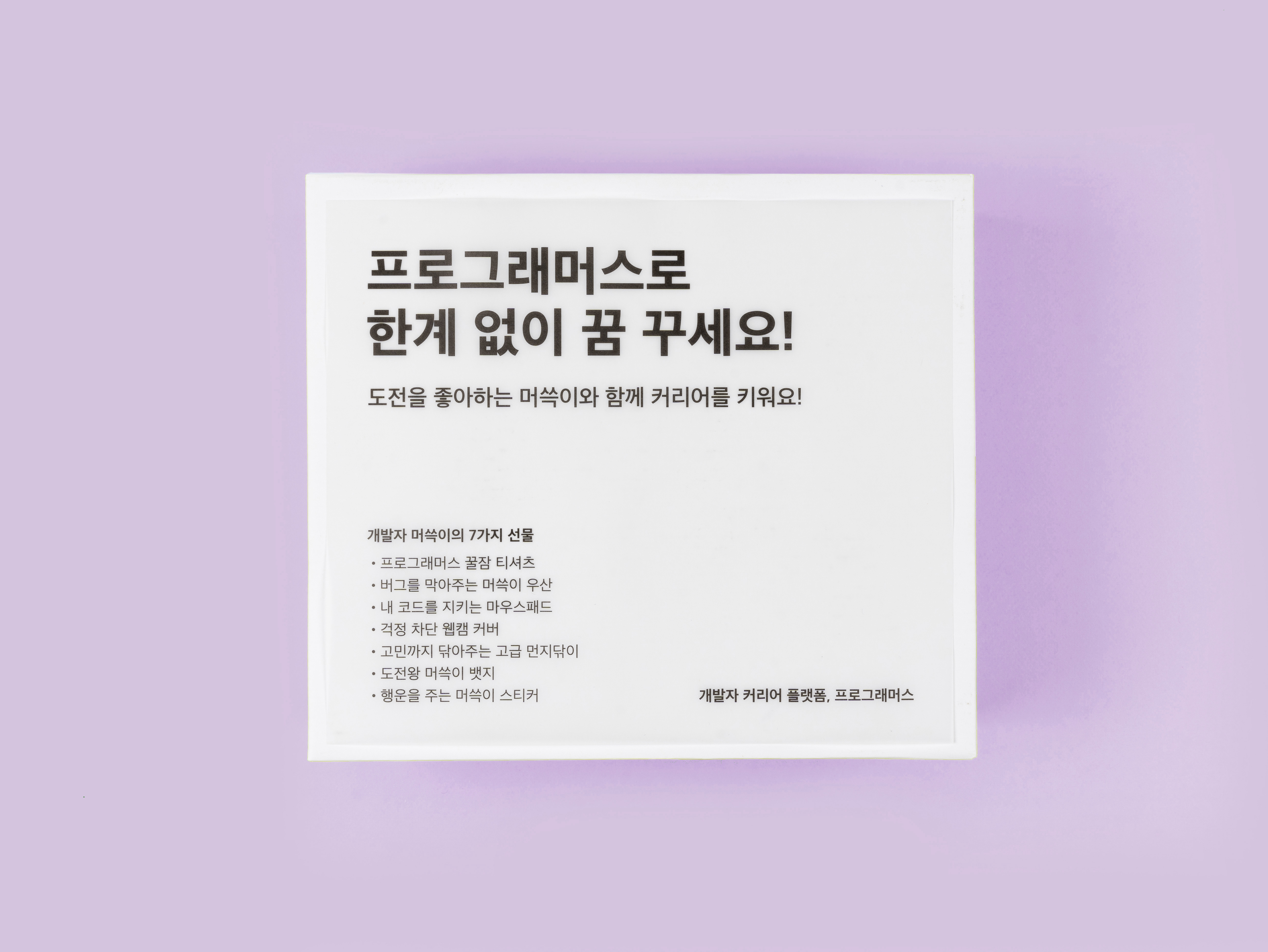 개발자 머쓱이가 주섬주섬 준비한 7가지 선물들 새로워진 프로그래머스 키트의 별명은 머쓱이의 샤이닝 선물박스입니다. 반짝반짝 빛나는 커리어를 응원하는 선물이기 때문이죠. 샤이닝 선물박스에는 개발을 할 때도, 개발하다 쉴 때도 자주 사용할 수 있는 활용도 높은 7가지 굿즈들이 담겨있습니다.