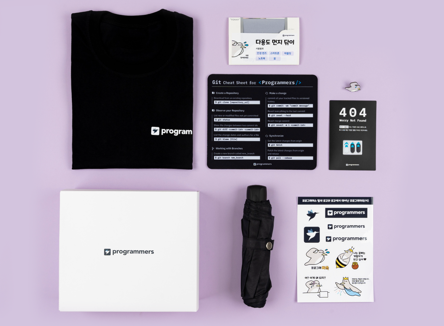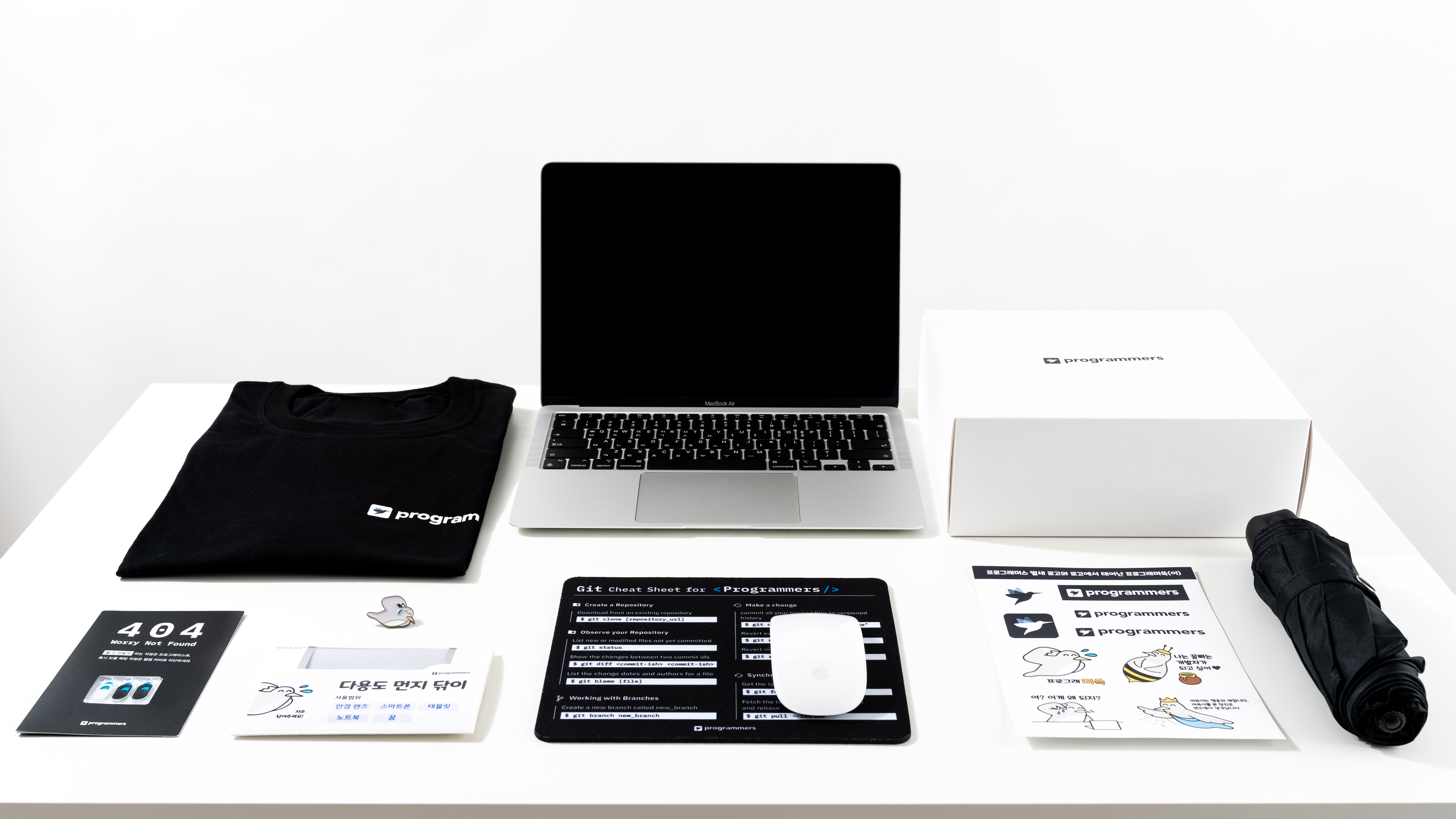 선물 구성품 : 머쓱이 우산, 프로그래머스 티셔츠, 머쓱이 뱃지, 마우스패드, 웹캠 커버, 먼지 닦이, 머쓱이 스티커