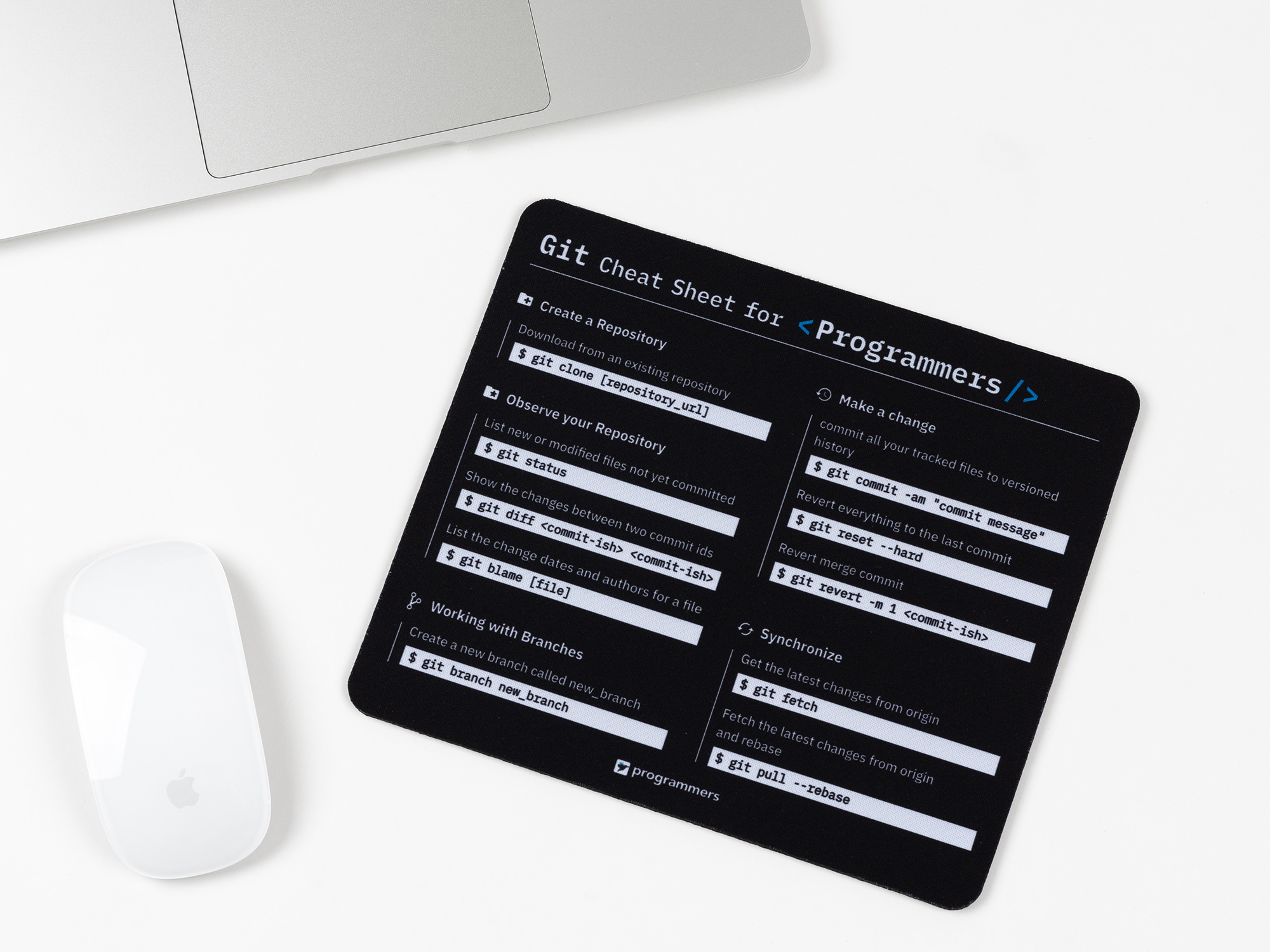 Git으로 버전관리하는 개발자라면 이 마우스패드를 꼭 사용하세요! 머쓱이가 준비한 네 번째 선물은 '내 코드를 지키는 마우스패드'입니다. 다 아는 내용도 큰 실수 앞에선 머리가 새하얘지는 법이죠. Git cheat sheet 마우스패드가 백지장이 되어버린 내 머리를 대신해 코드를 알려드립니다. 급히 롤백해야 하는 순간!😱당황해서 코드가 기억나지 않을 때 마우스패드를 git cheat sheet으로 유용하게 사용할 수 있어요.