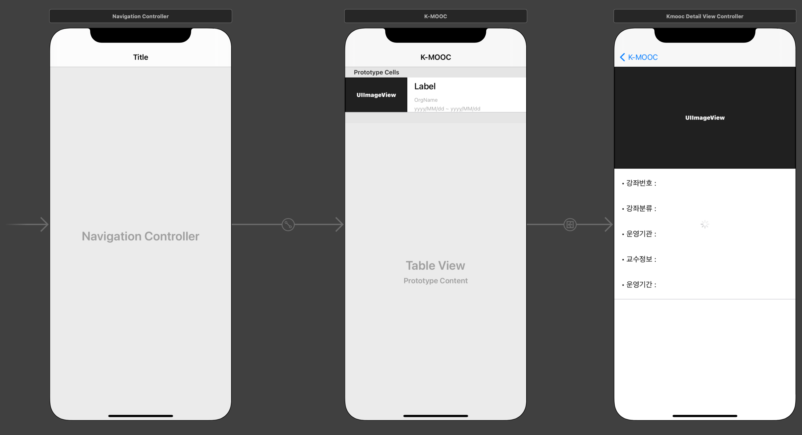 KmoocListViewController와KmoocDetailViewController의 두 개 ViewController 로 구성된 단순한 서비스 입니다. List 에서 Detail 로의 이동은 segue를 사용하고 id를 전달하여 Detail 화면에서 fetching하게 됩니다.