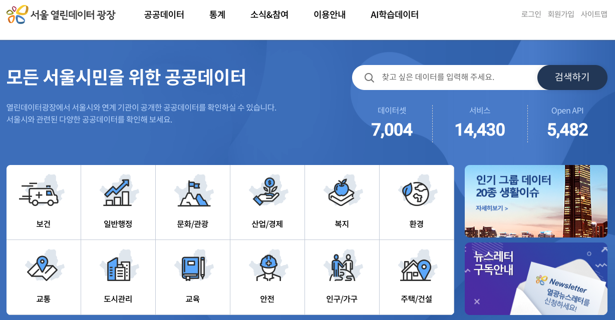 참고로 서울시에서 운영하는 서울 열린데이터 광장 https://data.seoul.go.kr/ 도 있으니 함께 참고하면 좋습니다.