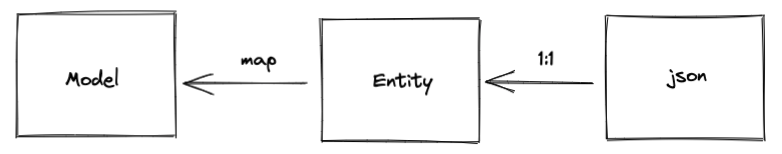 json 이 전달되면 이것을 1:1로 변환할 수 있도록 모든 필드 구성이 동일한 중간객체인 Entity 를 만듭니다. 그리고 그 Entity를 가지고 Model을 변환하는 과정입니다.